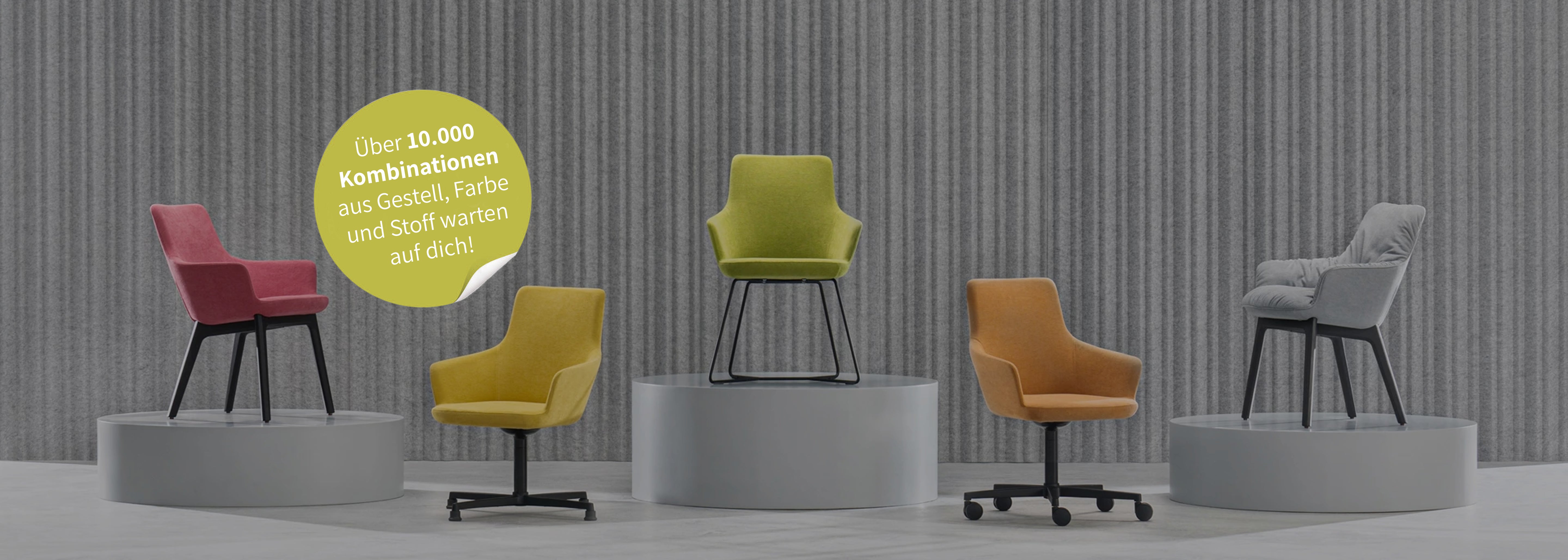 Gestalte deinen Stuhl, wie er zu dir passt: Wähle aus einer Vielzahl an Stoffen, Farben und Gestellen und erschaffe ein Sitzmöbel, das perfekt in dein Unternehmen passt. Ob fürs Büro, den Konferenzraum oder die Lounge – bei uns bekommst du Individualität und Qualität in einem.